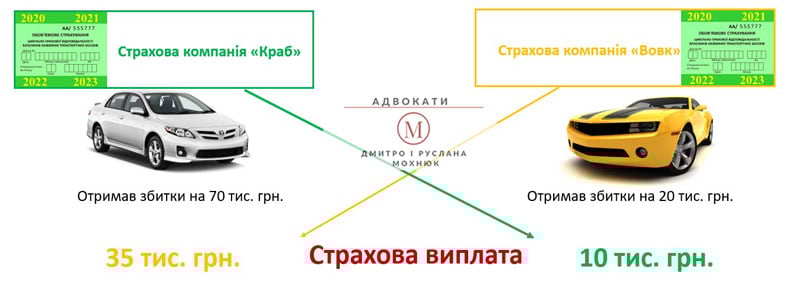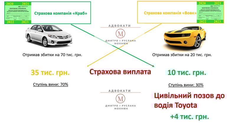 Той із водіїв, хто винен у ДТП більше, має відшкодувати іншому водієві різницю. Якщо ступінь вини поділяють як 60% на 40%, то 50% збитків водій отримає від страхової, а решта 10% — за цивільним позовом до винуватця.