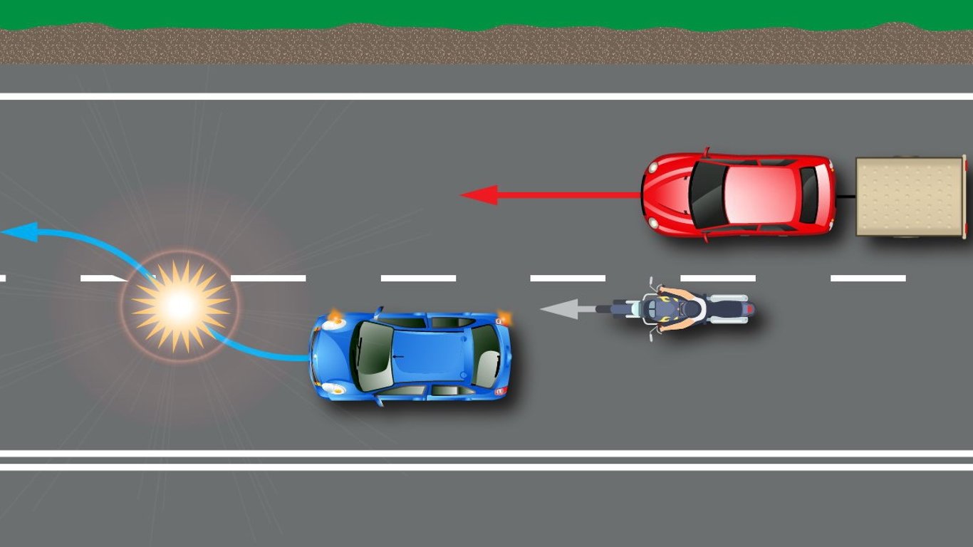 Синє авто перебудовується в праву смугу. Водій вмикає сигнал повороту та уходить праворуч. Саме в цю мить відбувається зіткнення з мотоциклістом, якого він навіть не бачив. Хто з них винен у ДТП?