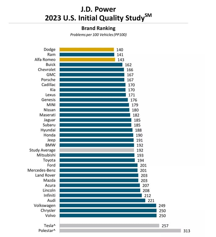Рейтинг составляла американская компания JD Power методом опроса владельцев новых автомобилей. У водителей выясняли количество поломок на 100 автомобилей определенной марки. Результаты 2023 года впечатляют – в среднем 192 неисправности на 100 машин.