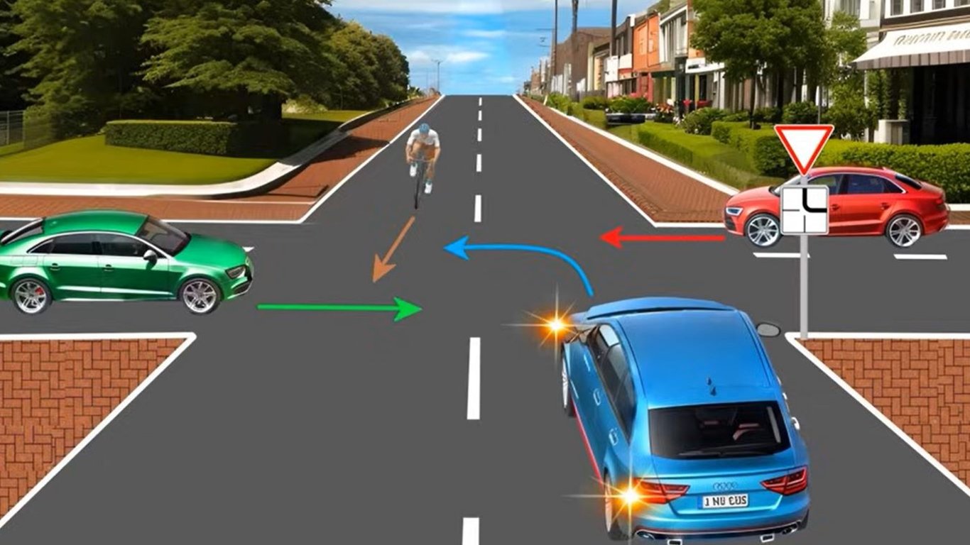 Эти знаки дают понять, что по главной дороге двигаются велосипедист и водитель красного автомобиля, а значит, именно они будут определять, кто проедет перекресток первым, а кто — вторым. По второстепенной дороге движутся водители зеленой и синей машин, и они будут определять, кто проедет последним.
