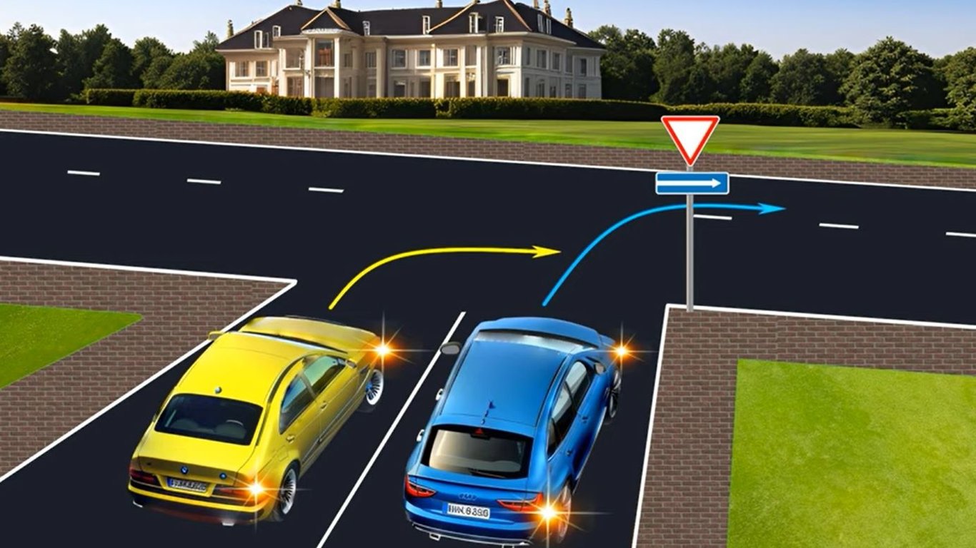 На первый взгляд может показаться, что правила нарушает водитель желтого авто, который для поворота направо не занял соответствующее крайнее положение на проезжей части, а водитель синего все делает правильно.