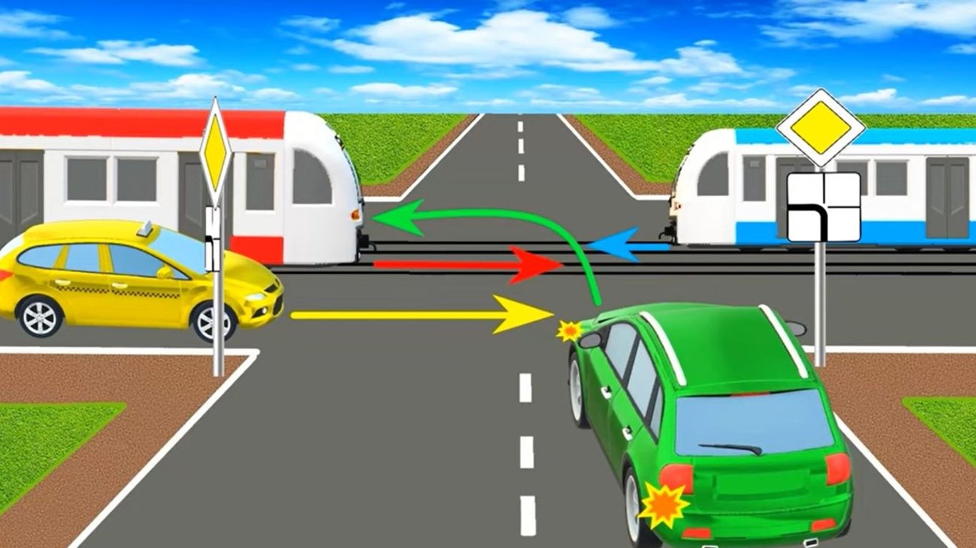 На перекрестке встретились два трамвая и два автомобиля. Кого должен пропустить водитель зеленой машины?