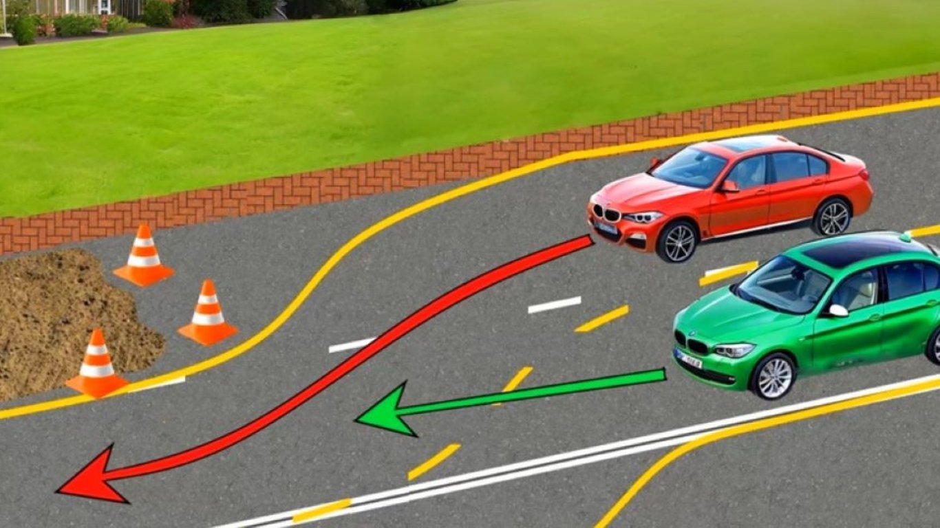 Згідно з тимчасовою розміткою, червоний автомобіль продовжує рух у своїй смузі. Тоді як водій зеленого авто в цей момент якраз змінює смугу.