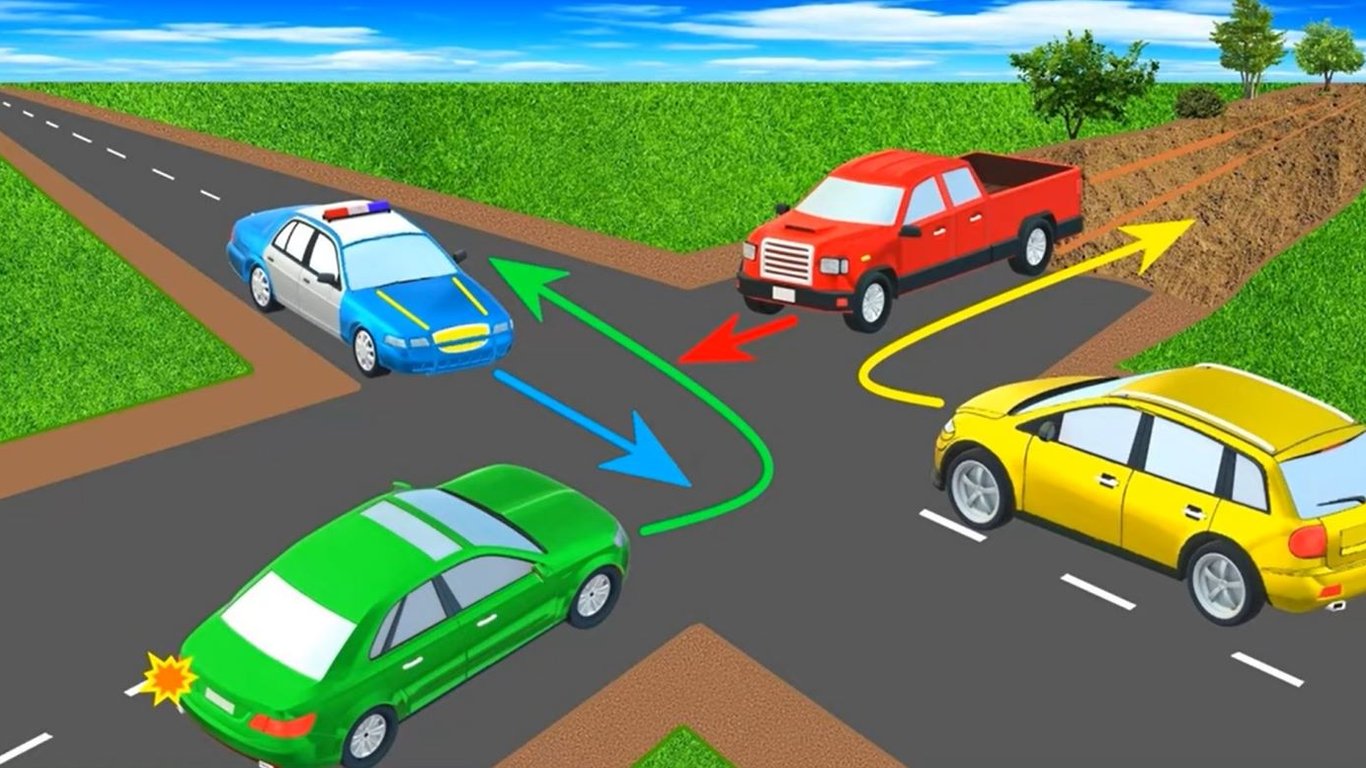 До перехрестя під'їхали чотири автомобілі. Жовтий повертає праворуч, зелений — ліворуч, а червоний та поліцейський автомобілі проїжджають прямо.