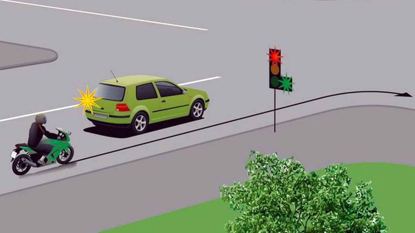 На перехресті автомобіль очікує увімкнення зеленого сигналу світлофора, щоб продовжити рух прямо. Мотоцикліст намагається протиснутися між краєм проїжджої частини та авто, щоб повернути праворуч.